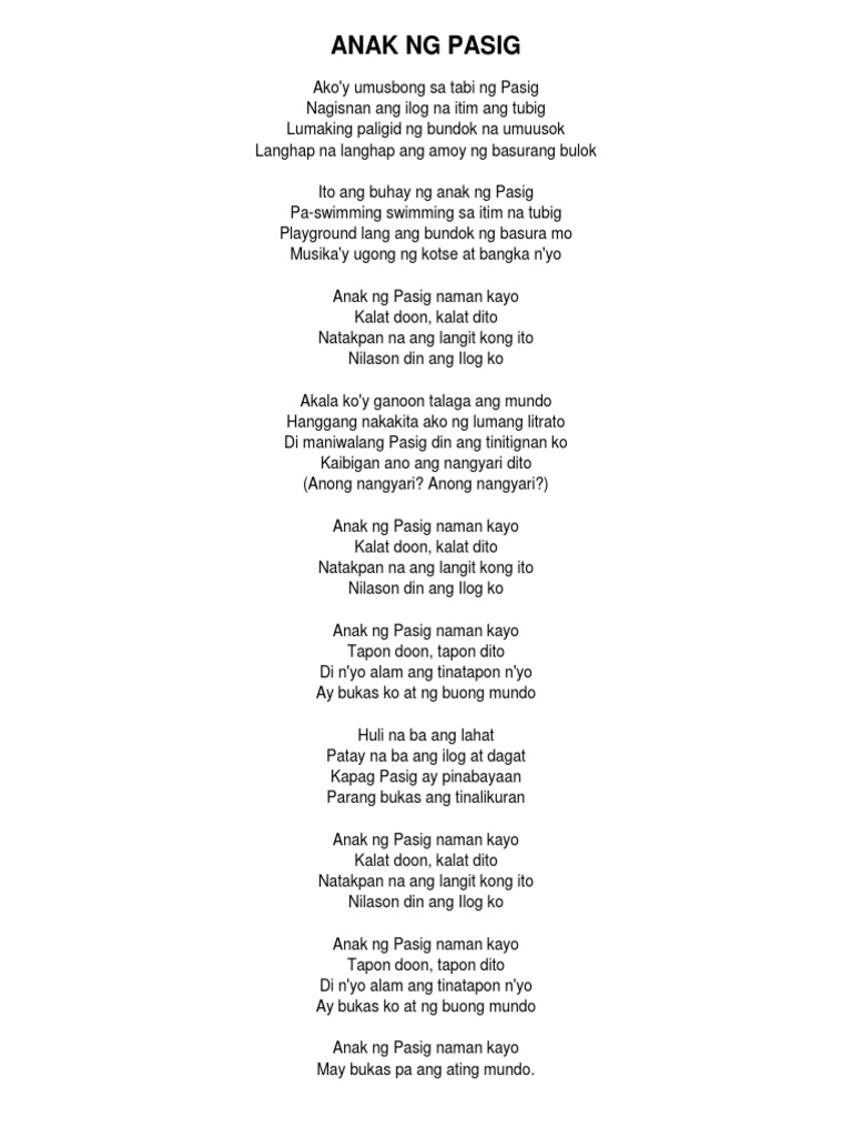 Anak ng Pasig naman kayo Kalat doon kalat dito Natakpan na ang langit kong ito Nilason din ang Ilog ko Anak ng Pasig naman kayo Tapon doon tapon dito Di niyo alam ang tinatapon niyo Ay bukas ko at ng buong mundo Huli na ba ang lahat Patay na ba ang ilog at dagat Kapag pasig ay pinabayaan Parang bukas ang tinalikuran Anak ng Pasig naman kayo.